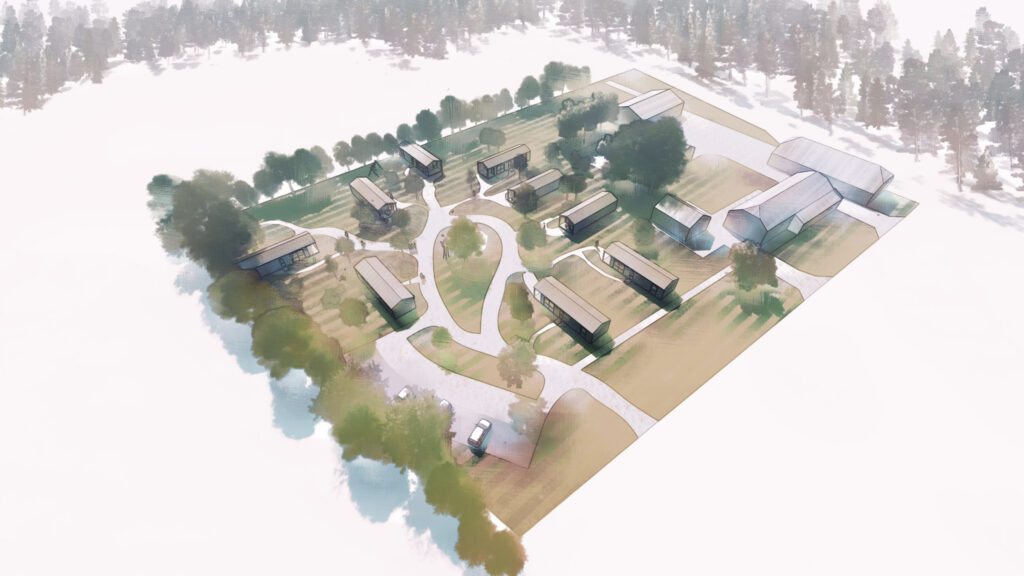 Natuurlijk dromen we verder. Het plan is dat er uiteindelijk tien sfeervolle vakantiehuisjes komen, verspreid over het veld, elk met z’n eigen plekje in het groen. Hieronder alvast een kijkje in de toekomst: schetsen en impressies van hoe Het Gagelsveld er straks uit zou kunnen zien.